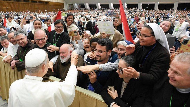 पोप ने कहा कि उन्हें उनके साथ होने पर प्रसन्नता हो रही है, क्योंकि वे दुनिया भर के सभी समर्पित पुरुषों और महिलाओं का प्रतिनिधित्व करते हैं। उन्होंने कहा कि उन्होंने उनका हृदय से आलिंगन किया, एक ऐसा आलिंगन जो, "पृथ्वी के सबसे दूरस्थ कोनों तक भी पहुँचना चाहता है - क्योंकि मुझे पता है कि आप में से कई लोग वहीं मिल सकते हैं।"