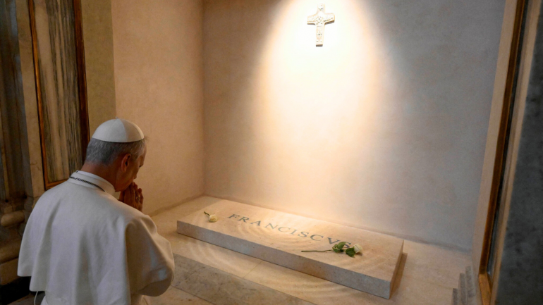 स्फोर्ज़ा चैपल और पॉलीन चैपल के बीच स्थित अपने पूर्ववर्ती की संगमरमर की समाधि पर, पवित्र पिता ने पुत्रवत सम्मान और स्मृति चिन्ह के रूप में सफेद गुलाबों का एक गुलदस्ता अर्पित किया। यह स्थान, जहाँ लिसीक्स की संत थेरेसा के सम्मान में हमेशा एक सफेद गुलाब रखा जाता है, पोप फ्रांसिस को विशेष रूप से प्रिय था, जिन्होंने जीवन भर इस संत के प्रति गहरी श्रद्धा रखी।